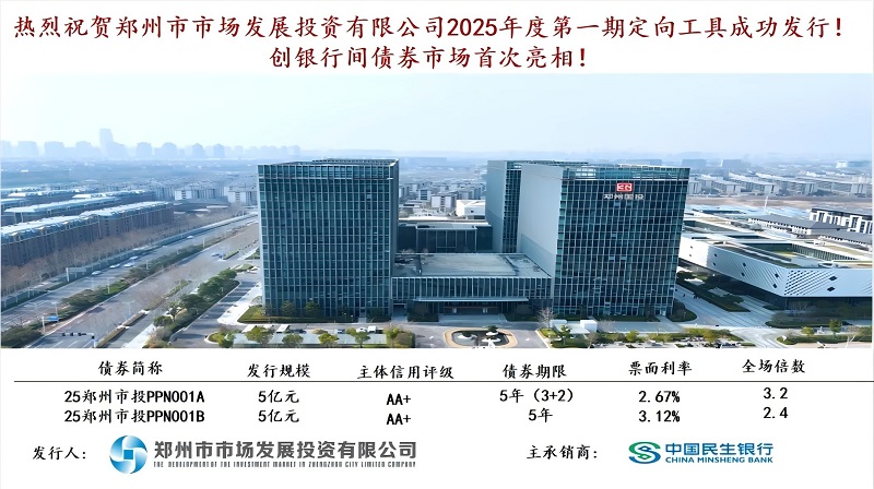 近日,鄭州市市場發(fā)展投資有限公司(以下簡稱“鄭州市投”,外部主體評級AA+)成功發(fā)行2025年度第一期定向債務融資工具,進一步優(yōu)化了公司融資結構。本期債券由民生銀行擔任主承銷商,發(fā)行總規(guī)模10億元,創(chuàng)新采用“3+2年”(票面利率2.67%)與“5年”(票面利率3.12%)雙期限結構,創(chuàng)下近期同期限、同評級企業(yè)信用債首發(fā)利率較低水平,顯示出資本市場對鄭州國企發(fā)展前景的高度認可。